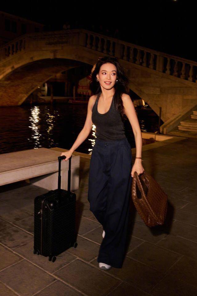 大胆地秀出好身材,也是舒淇的穿衣心得,修身款式的低领吊带搭配藏蓝色裤,增加露肤面积,尽显风情万种。