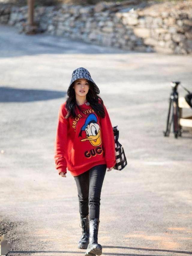 红黑配也是非常经典的组合,遮臀长度的红色唐老鸭毛衣,俏皮又有趣,搭配黑色小脚裤,“上宽下窄”,衬托的腿型又细又长。